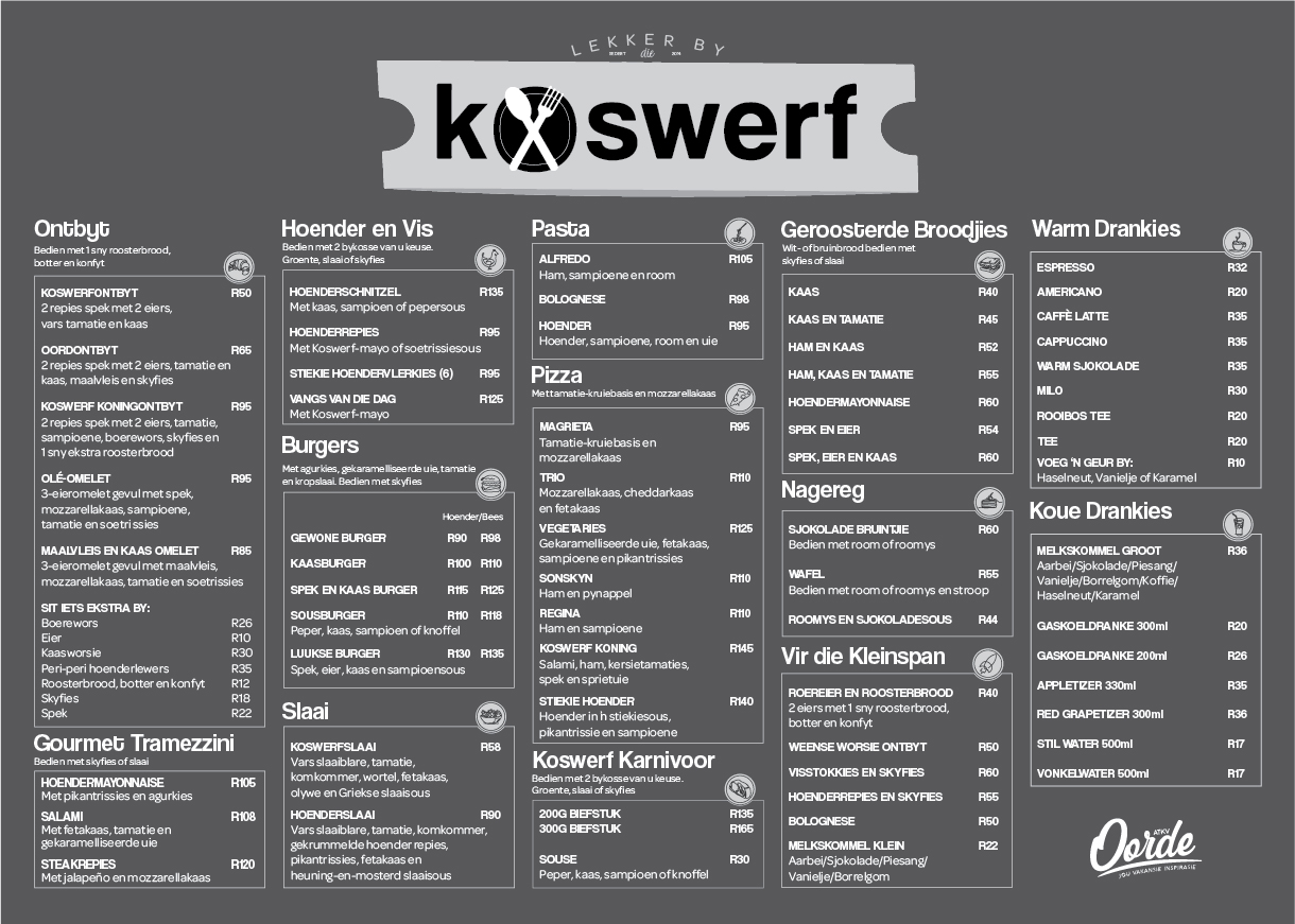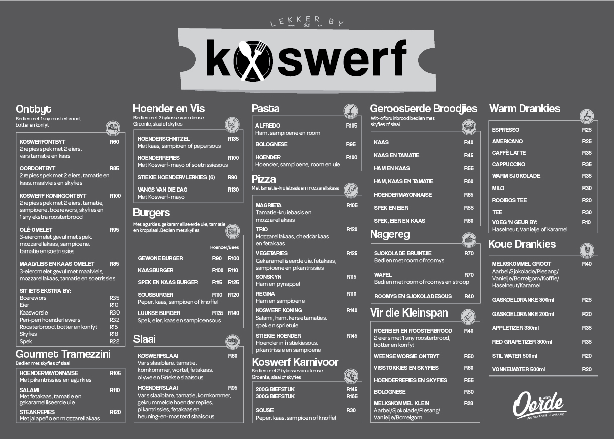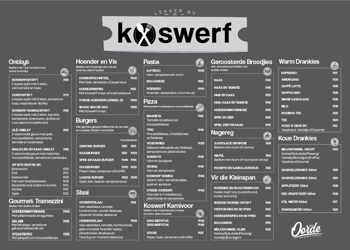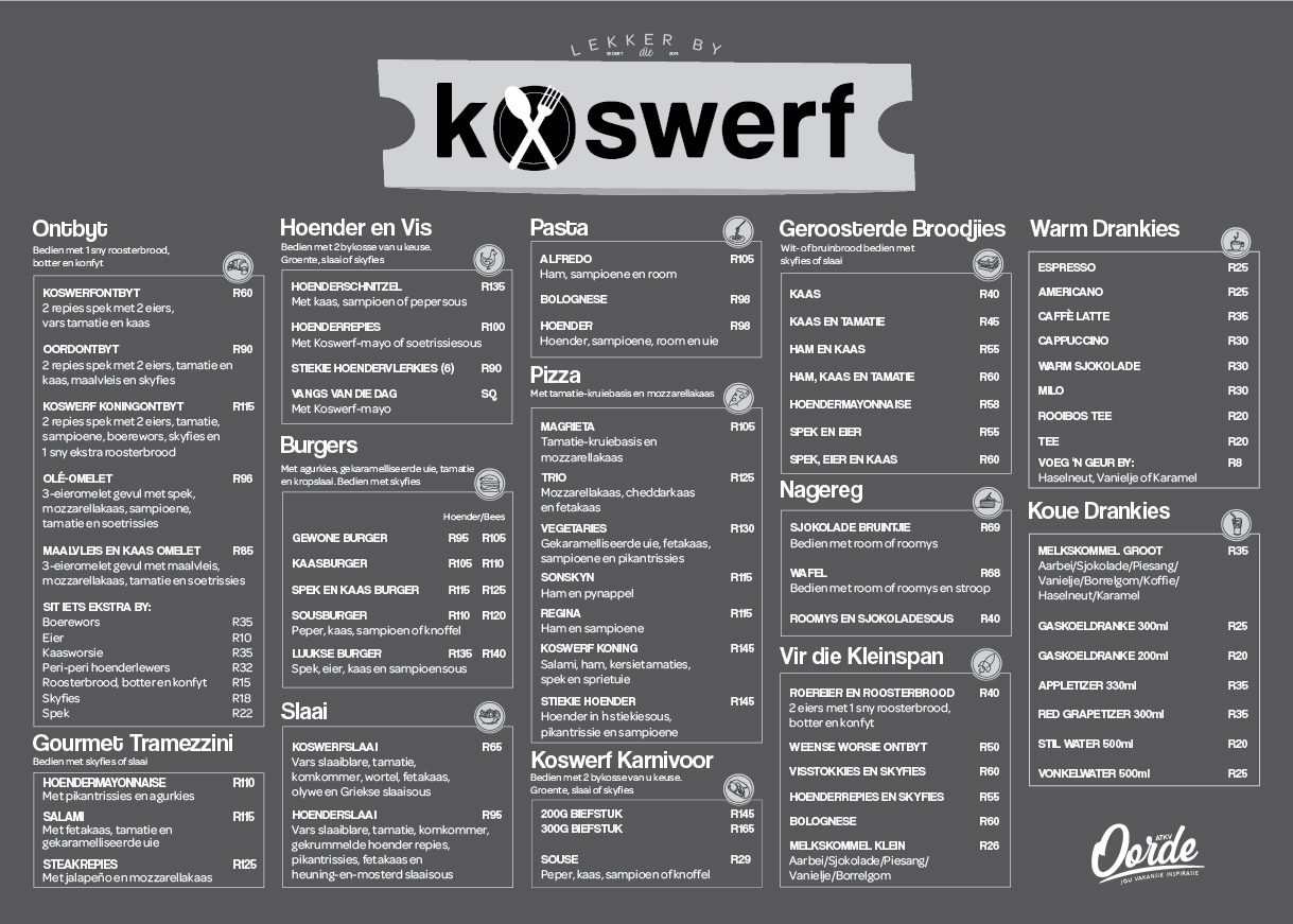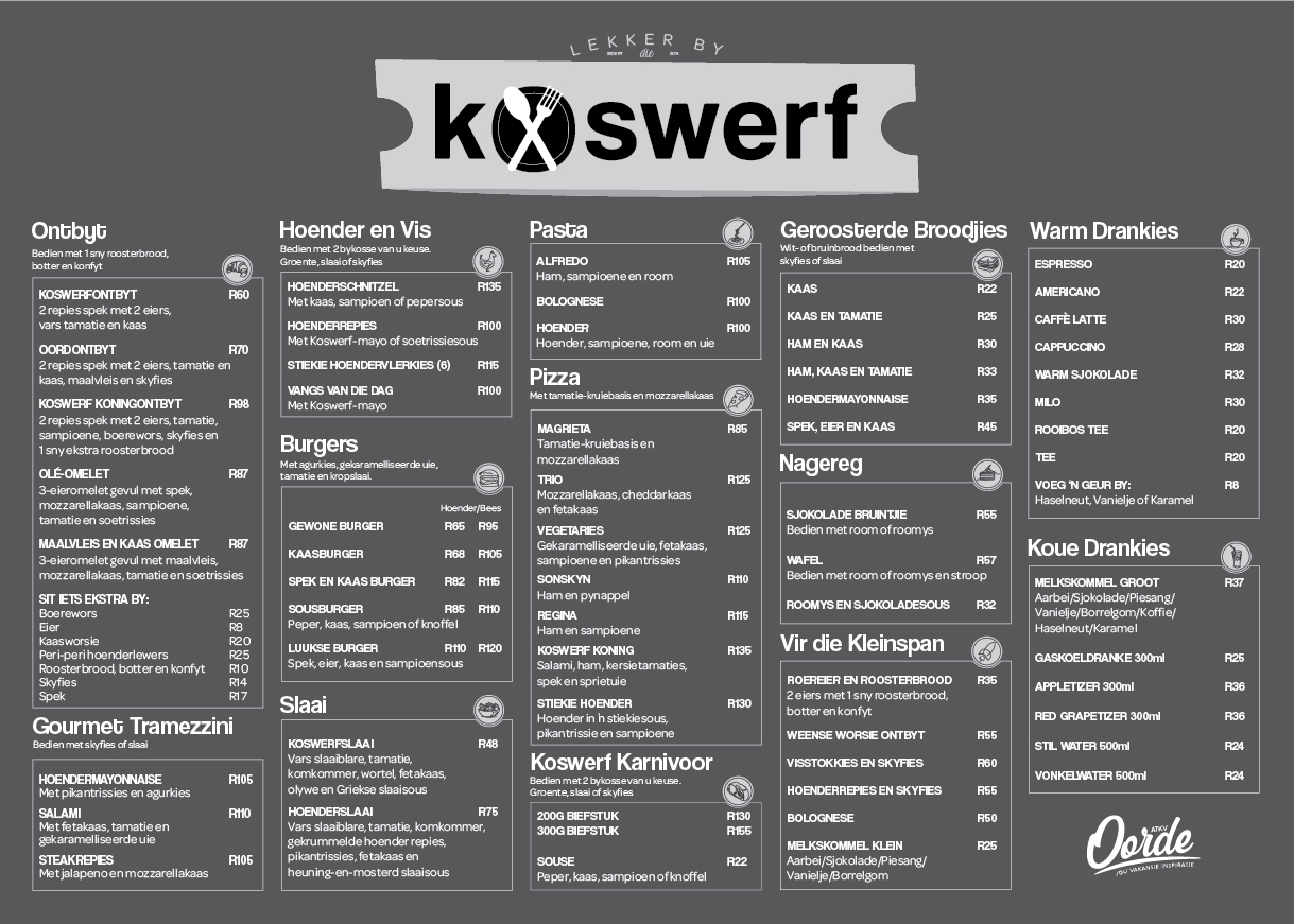 Ons restaurant vier die nostalgie van tuisgemaakte maaltye met ’n spyskaart wat ’n verskeidenheid tradisionele disse, stewige ontbyte en vars slaaie bied om elke lus te bevredig. Of jy nou energie wil kry vir ’n dag vol avontuur of ontspan met ’n salige aandete, Koswerf kombineer gehalte en waarde vir ’n onvergeetlike koservaring.