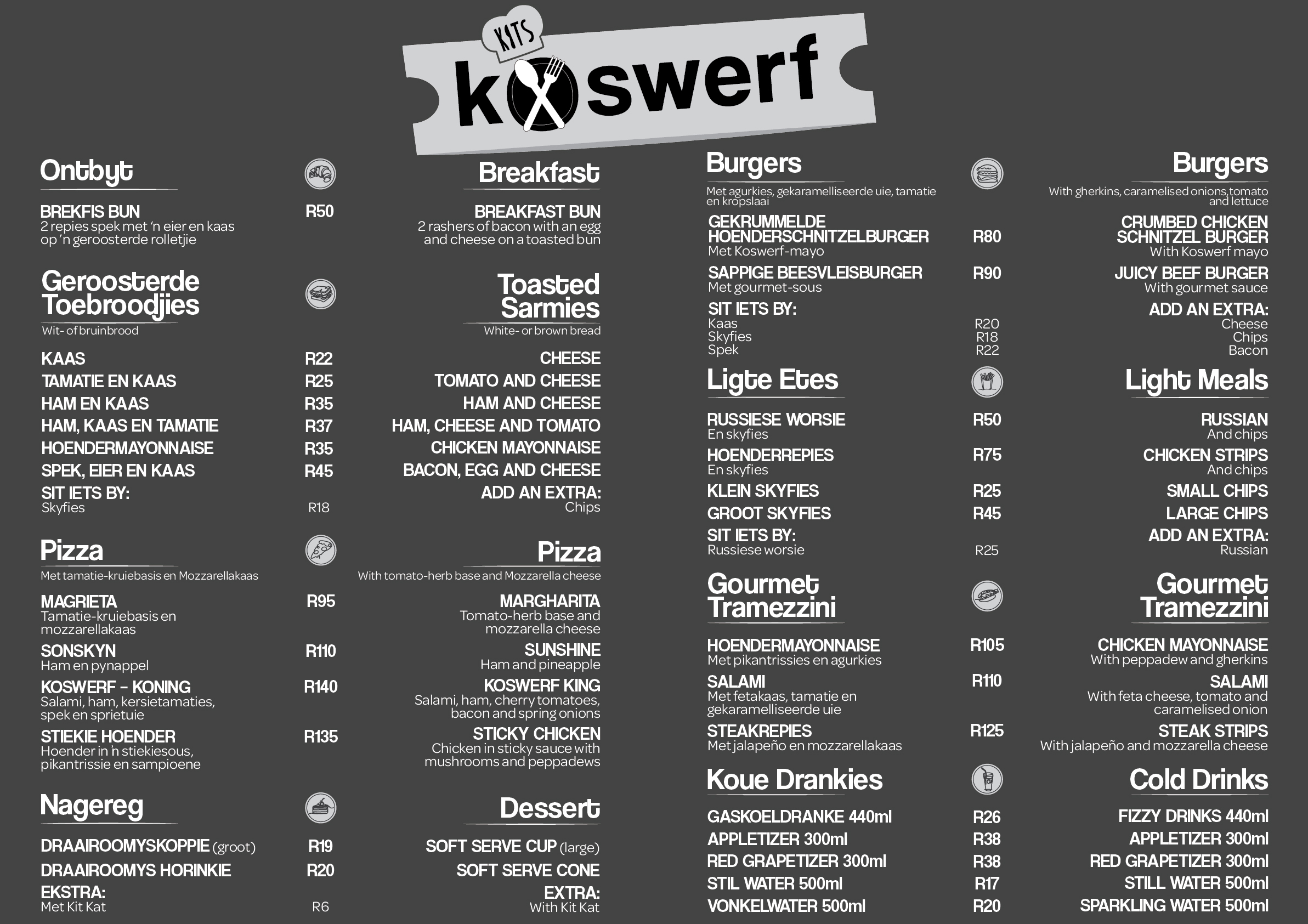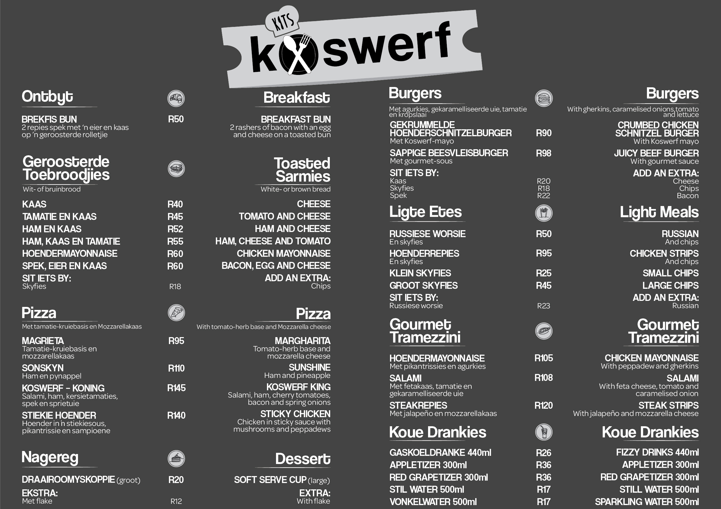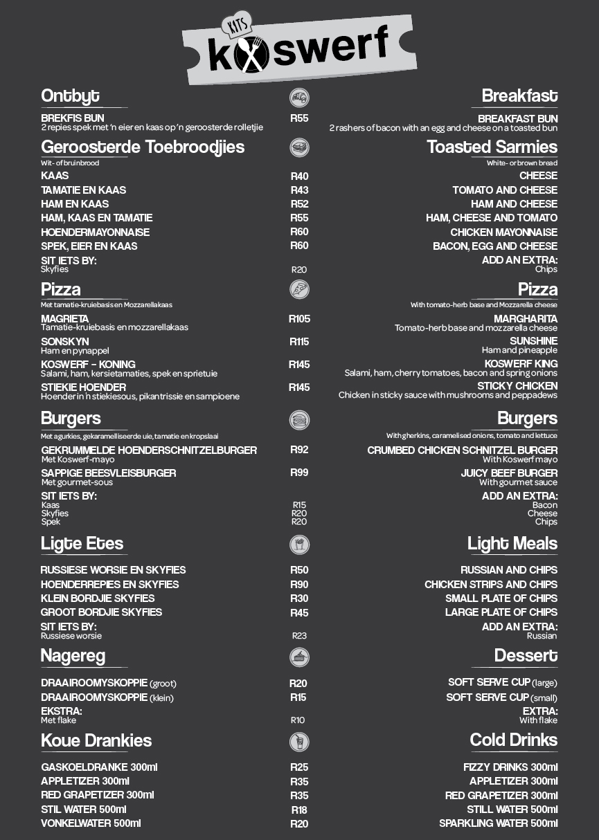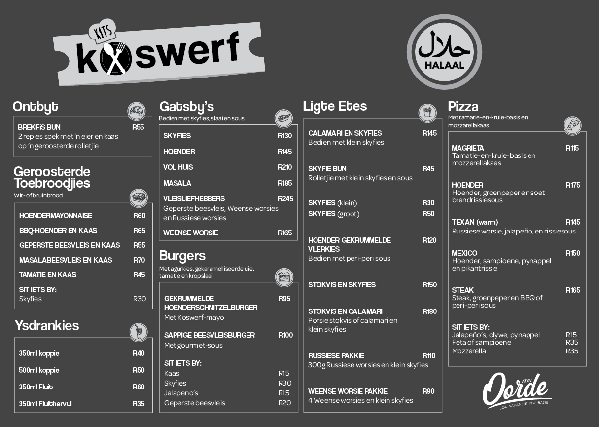 Ons restaurant vier die nostalgie van tuisgemaakte maaltye met ’n spyskaart wat ’n verskeidenheid tradisionele disse, stewige ontbyte en vars slaaie bied om elke lus te bevredig. Of jy nou energie wil kry vir ’n dag vol avontuur of ontspan met ’n salige aandete, Koswerf kombineer gehalte en waarde vir ’n onvergeetlike koservaring.